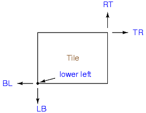 The top four functions return a position in magic internal coordinates; the last four return a pointer to the appropriate neighboring tile. Use of these macros is always preferred over the equivalent direct reference to the Tile structure, both because the meaning is clearer, and because the macros themselves could change in the future depending on the implementation (see the "Developer's Note", below).Thus, the "tile enumeration" function defined above first finds RT(tile), the rightmost tile connecting to the top of "tile", and then works leftward by finding BL() of the result. Each tile enumerated must attach to the top of "tile" as long as the x-coordinate of the right side of the enumerated tile is larger than the x-coordinate of the left side of "tile".
