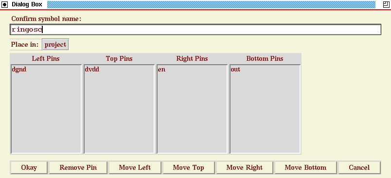 The default symbol generated by "Make Matching Symbol" will be a box (you can change this later if you wish), and the placement of pins around the symbol's bounding box is shown in the columns in the middle. The "Move" buttons at the bottom allow you to rearrange the pins. Put "dgnd" on the bottom, "dvdd" on top, "en" on the left, and "out" on the right by clicking on each pin name and then clicking the appropriate button at the bottom (note that the initial placement of pins is only a convenience; pins in the symbol drawing can be modified at any time after the symbol is created).