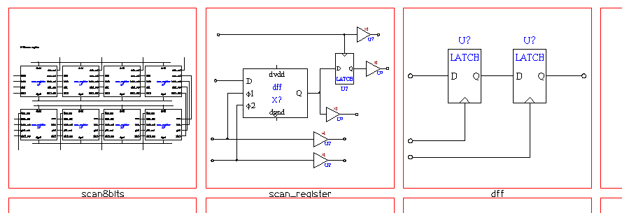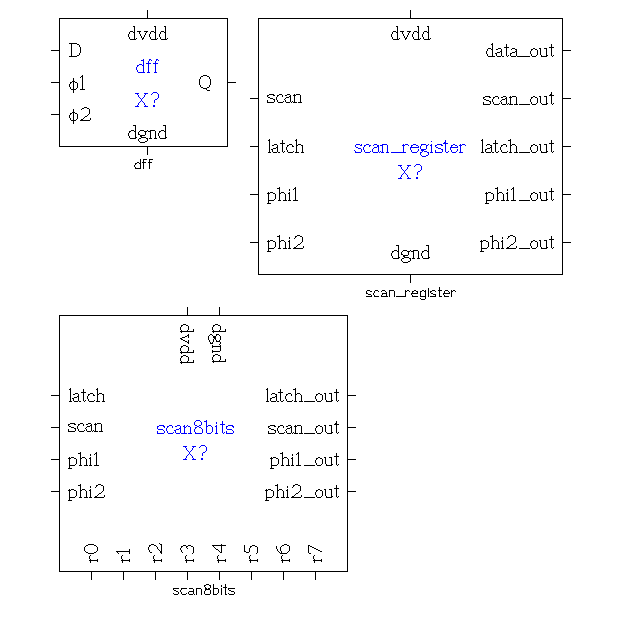 Now, make sure that all of these pages and the technology file have been written using the menu option "File->Write All...". Although the pages were not named, the "Make Matching Symbol" script should have copied the symbol names (without the technology prefix) to the schematics, and "Write All" should write three separate 1-page files. If you followed the naming conventions suggested above, the three files should be "dff.ps", "scan_register.ps", and "scan8bits.ps".
