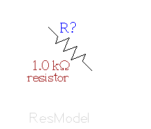 Virtual instances can also be rotated and scaled. Rotated parts can be very convenient for quick schematic drawing. On the library page "analog" there are rotated versions of each device, with the text appropriately counter-rotated so that the rotated device can be used in a schematic with the text always aligned to the direction of the page. Go to the library page "analog". Make a new virtual instance of symbol "ResModel" (key "V"). Rotate this device to 45 degrees with the "r" key. Push this instance, and counter-rotate the text (key "R"). Move the text so that it is not overlapping the component, then pop back out to the library. You should now have a 45-degree rotated resistor symbol in your library. It looks like this: