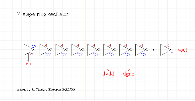 Another change is that the button in the lower left-hand corner of the XCircuit window with the text "Symbol" is now highlighted black and white. Click on it to see the new symbol for "ringosc":