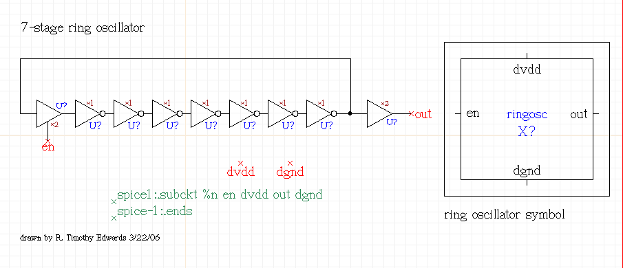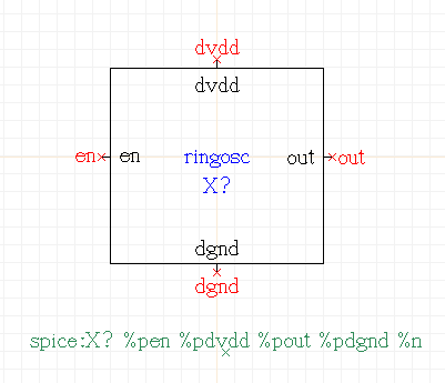 spice1:.subckt %n en dvdd out dgndThe first line defines the format of the SPICE line. The "%n" gets substituted with the name of the schematic when written to the SPICE output file; in this case, the word "ringosc". The line tag "spice1:" indicates that the line will be the first line output for this subcircuit (before any components internal to the subcircuit), and the line tag "spice-1:" indicates that the line will be the first line output after all components have been written (since there are no lines "spice-2", "spice-3", etc., this will therefore also be the last line written for this subcircuit.