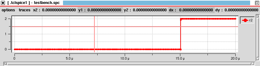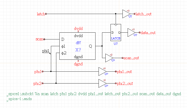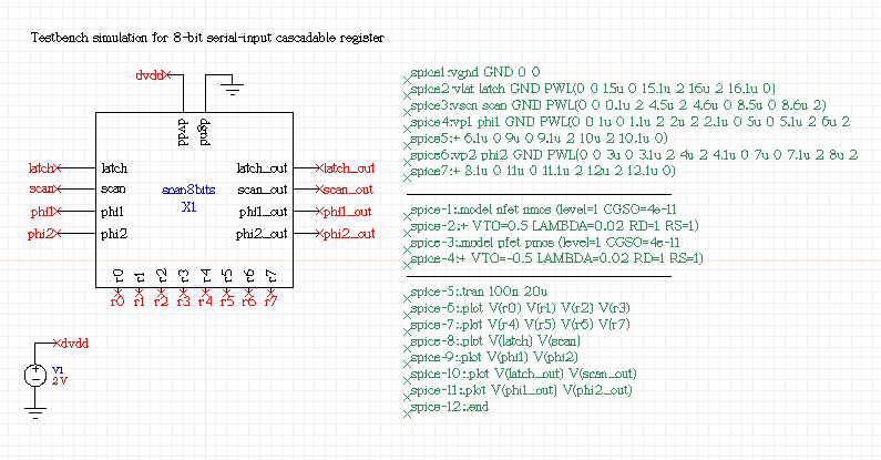 line text 1 *SPICE circuit from XCircuit v3.6 rev 19 2 3 .subckt scan8bits latch phi1 scan phi2 dvdd dgnd scan_out phi1_out phi2_out latch_out r6 r7 r1 r2 r3 r4 r5 r0 4 X1 int39 int40 int41 int42 dvdd phi1_out latch_out phi2_out 5 + scan_out r7 dgnd scan_register 6 X2 int35 int36 int37 int38 dvdd int41 int40 int42 7 + int39 r6 dgnd scan_register 8 X3 int31 int32 int33 int34 dvdd int37 int36 int38 9 + int35 r5 dgnd scan_register 10 X4 int46 int45 int44 int43 dvdd int33 int32 int34 11 + int31 r4 dgnd scan_register 12 X5 int27 int28 int29 int30 dvdd int44 int45 int43 13 + int46 r3 dgnd scan_register 14 X6 int23 int24 int25 int26 dvdd int29 int28 int30 15 + int27 r2 dgnd scan_register 16 X7 int19 int20 int21 int22 dvdd int25 int24 int26 17 + int23 r1 dgnd scan_register 18 Xtest scan latch phi1 phi2 dvdd int21 int20 int22 19 + int19 r0 dgnd scan_register 20 .ends The netlist above is appropriate for purposes of comparing the schematic against a layout (layout vs. schematic, or "LVS"). However, it still is missing vital information required for simulation. A schematic of this type is usually referred to as the "device under test", or "DUT", and is instantiated inside a separate schematic called the "bench test" schematic. This is what we will do in the next task.